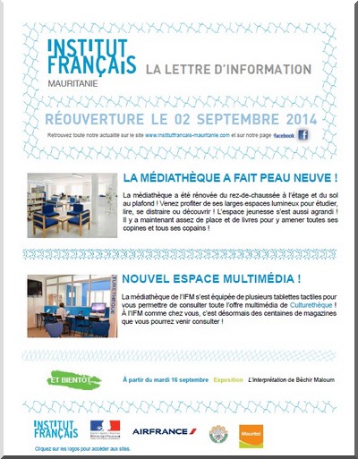 N’hésitez pas à inviter vos amis à s’inscrire en envoyant un message à : info@institutfrancais-mauritanie.com, à consulter régulièrement notre site www.institutfrancais-mauritanie.com et à devenir fan de notre page Facebook.