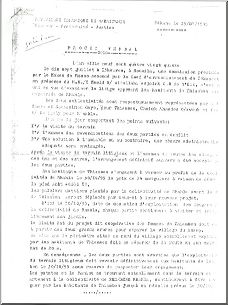 A Thiambène (30 kilomètres de Rosso), un conflit vieux de 1995, a refait surface (voir en fac similé). Un problème foncier avait surgi dans ce village et le droit aurait été dit en faveur des villageois, droit qui a cimenté leur appartenance sur ces terres.