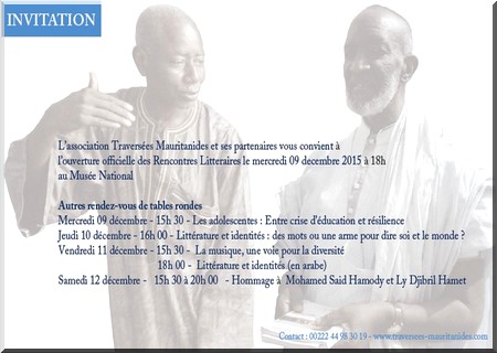 09-12-2015 15:10 - Ouverture ce mercredi 9 décembre de la 6e édition des rencontres Traversées Mauritanides sous le thème Littérature et identités. A la mémoire des écrivains Saïd Ould Hamody et de Ly Djibril Hamet