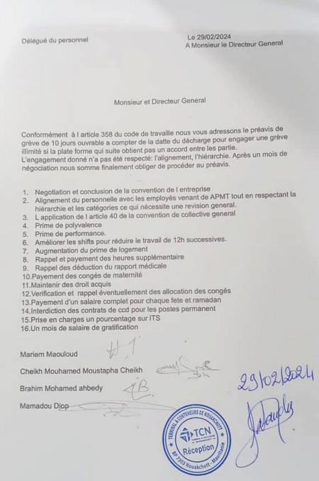 « Après un mois de négociations, nous sommes finalement obligés de procéder à la mise en exécution du préavis », indique la lettre signée par la Déléguée générale des employés, Mariem Maouloud assistée de Cheikh Mohamed Moustapha Cheikh, Brahim Mohamed Ahbedy et Mamadou Diop.