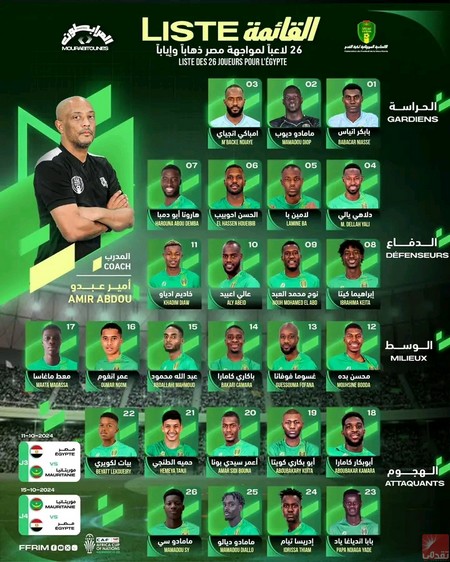Le sélectionneur national Amir Abdou a dévoilé sa liste à l’approche de la double opposition face aux Pharaons, le 11 octobre au Caire et le 15 octobre à Nouakchott, dans le cadre des troisième et quatrième journées des éliminatoires de la CAN 2025.