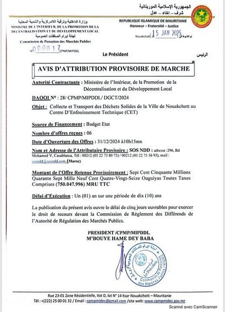 Ce contrat a été confié à l’entreprise marocaine SOS NDD, basée à Casablanca, pour un montant de 750 047 996 ouguiyas, soit environ 20,55 millions de dirhams marocains. Le financement de cette opération provient du budget de l’État mauritanien.